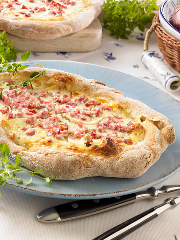 Flammkuchen mit Schinkenwürfeln